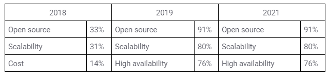 有时,调查数据会揭示调查本身随时间的变化。在 2018 年,我们要求用户确定使用 Ceph 的最重要的原因,您可以在下方看到结果。在 2019 年和 2021 年,问题询问了用户选择 Ceph 的所有原因。
