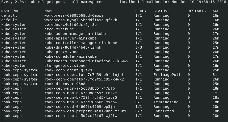 假设存在 Kubernetes 集群(我们只需使用 minikube 即可),克隆 Rook git 仓库 并签出最新的 v0.9 标签版本,就可以使用两个命令在不到五分钟内启动 Rook 运算符和 Ceph 集群。太棒了!