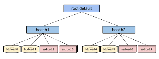但是,设置 CRUSH 规则以仅将数据放置在特定设备类上是一项繁琐的任务。 规则在 CRUSH 层次结构中工作,但如果设备混合在相同的主机或机架中(如上所示的示例层次结构),它们将(默认情况下)混合在一起并出现在层次结构的相同子树中。 以前,手动将它们分成单独的树需要为每个设备类创建中间节点的多个版本(例如,“host h1-ssd”和“host h1-hdd”),并且需要管理员禁用“osd crush update on start”选项,该选项可以自动执行大部分 CRUSH 层次结构管理负担。 这太糟糕了。