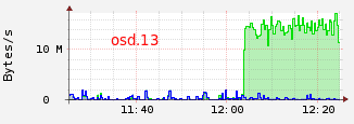 在这种情况下,我们可以看到 id 为 13 的 osd 已添加到这两个放置组。Pg 3.183 和 3.83 将分别从 osd 5 和 12 中移除。如果我们查看 osd 带宽,我们可以看到这些传输 osd.1 —> osd.13 和 osd.5 —> osd.13