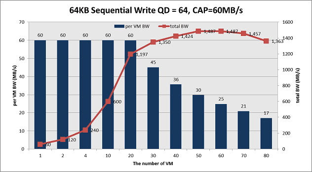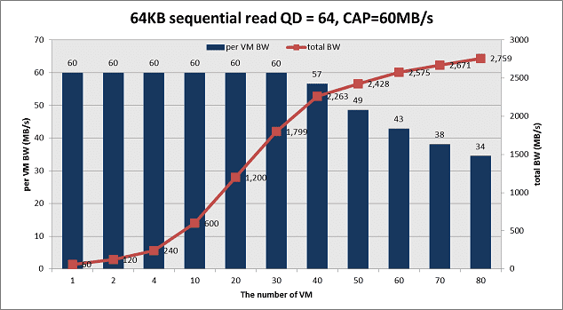 这是关于 Ceph RBD 性能的第二篇文章。在 第一部分 中,我们讨论了 Ceph 上的随机 IO 性能。这次我们分享顺序读/写测试数据。以防您忘记我们的硬件配置,我们使用 40 个 1TB SATA 磁盘作为数据磁盘,以及 12 个 SSD 作为日志。并且使用 4 个 10Gb 链路将存储集群与客户端连接起来,从而提供足够的网络带宽。下图显示了 QD=64 和 CAP=60MB/s 每 VM 的 SR 和 SW 性能。随着 VM/VM 数量的增加,每个 VM 的吞吐量逐渐下降。SR 最大总吞吐量 2759MB/sec 出现在 VM=80,SW 峰值总吞吐量 1487MB/sec 出现在 VM=50。但是,考虑到我们预定义的 QoS 要求(每个 VM 的吞吐量大于预定义目标的 90%),我们选择 VM=40 用于 SR 和 VM=30 用于 SW,这导致报告的指标为 2263MB/sec(SR)和 1197MB/sec(SW)。