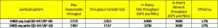 这个结果足够好吗?与我们对随机 IO 所做的方法类似,我们将本机磁盘性能作为参考进行测量。我们观察到每个磁盘的顺序带宽约为 ~160MB/sec,读和写都是如此。并且我们测量到单个 10Gb NIC 的值为 ~900MB/sec。理论上,40 个 SATA 磁盘预计可以提供 6400MB/sec 的读取和 3200MB/sec 的写入(replica=2)。并且 4x 10Gb 可以提供 ~3600MB/sec 的带宽。因此,如下表所示,Ceph 的最终效率为 SR 的 57% 和 SW 的 37%。与随机 IO 测试结果相比,这不是一个完美的结果。