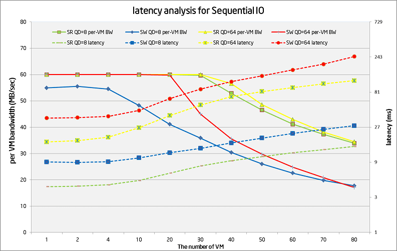 - 对于 QD=8 的情况,读取延迟从 4ms 开始,到 15ms 结束。写入延迟从 9ms 开始,到 28ms 结束。进一步的研究表明,物理 IO 模式随着 VM 数量的增加而变得更加随机,这是合理的。
