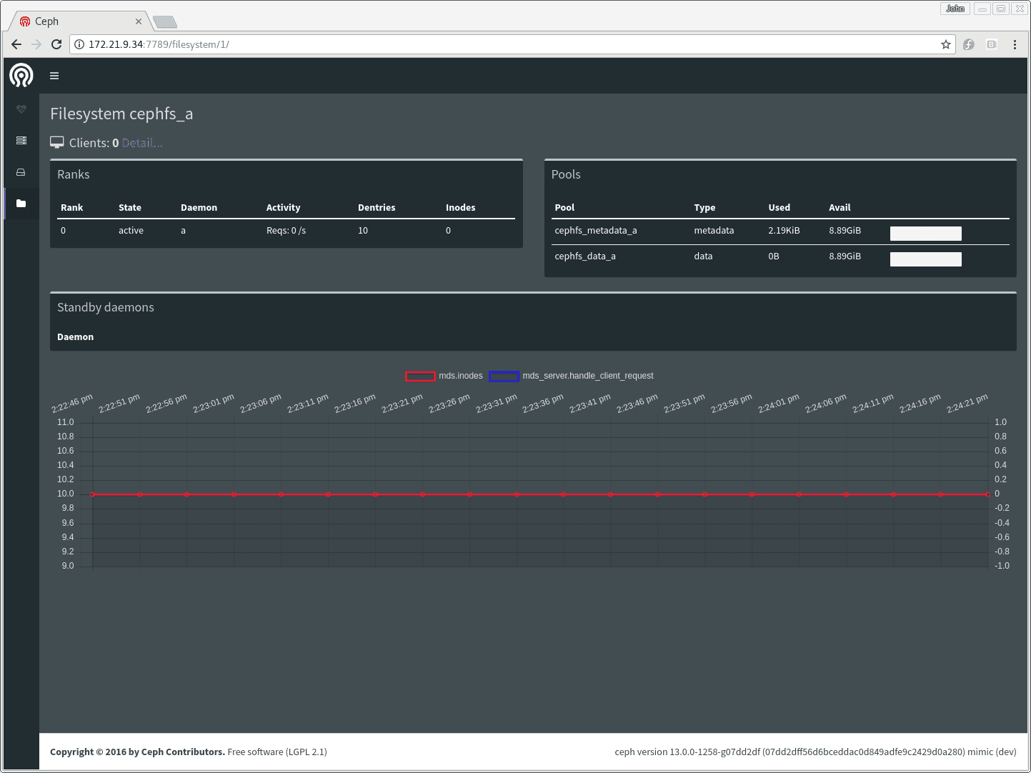 管理器会保留过去几分钟的性能计数器的简短内存历史记录。这使得仪表盘即使没有安装单独的时间序列数据库,也能呈现一些简单的图表——例如,文件系统页面显示 MDS 操作速率和缓存大小的简短历史记录。