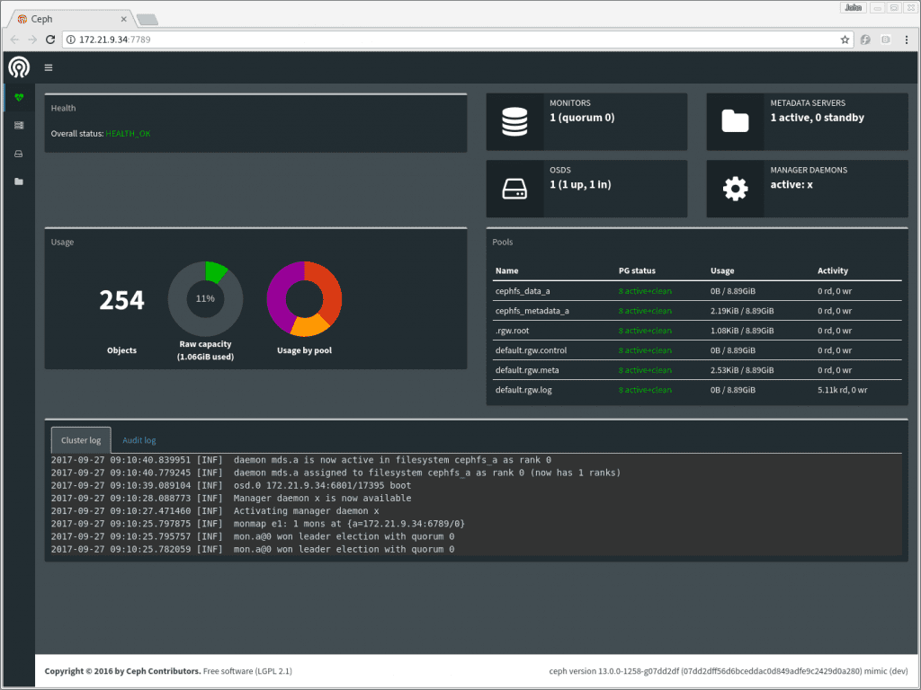 仪表盘模块包含在 ceph-mgr 包中,因此如果您已升级到 Luminous,那么您已经拥有它了!启用仪表盘只需一条命令