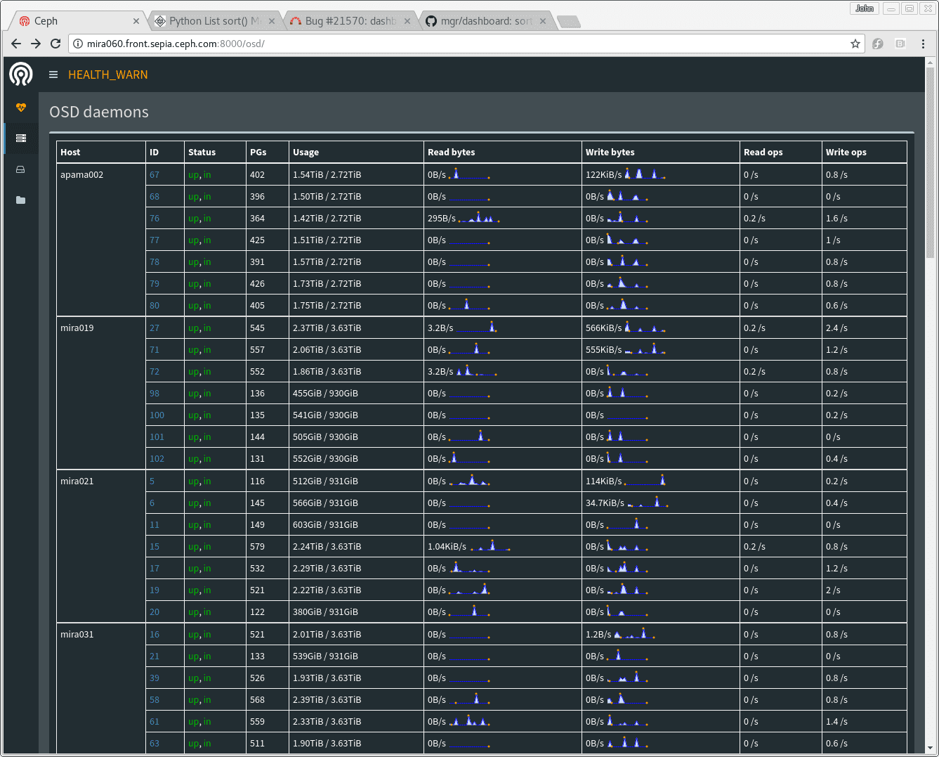 “集群”菜单部分包括服务器列表和 OSD 列表。服务器列表显示哪些服务正在哪个服务器上运行,OSD 列表按服务器显示 OSD,并显示它们的启动/停止、进/出状态。