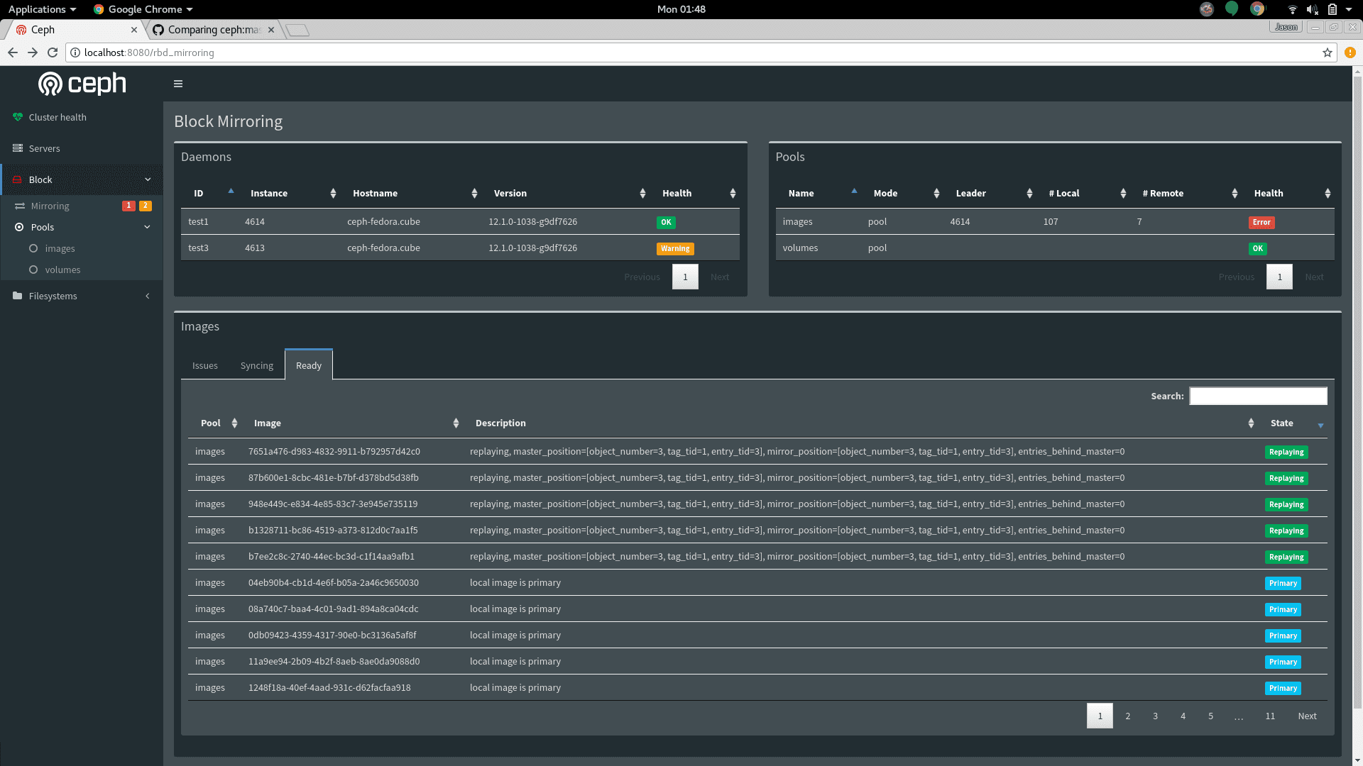 “块”部分提供有关 RBD 镜像以及正在运行的任何 rbd-mirror 或 iSCSI 服务的信息。