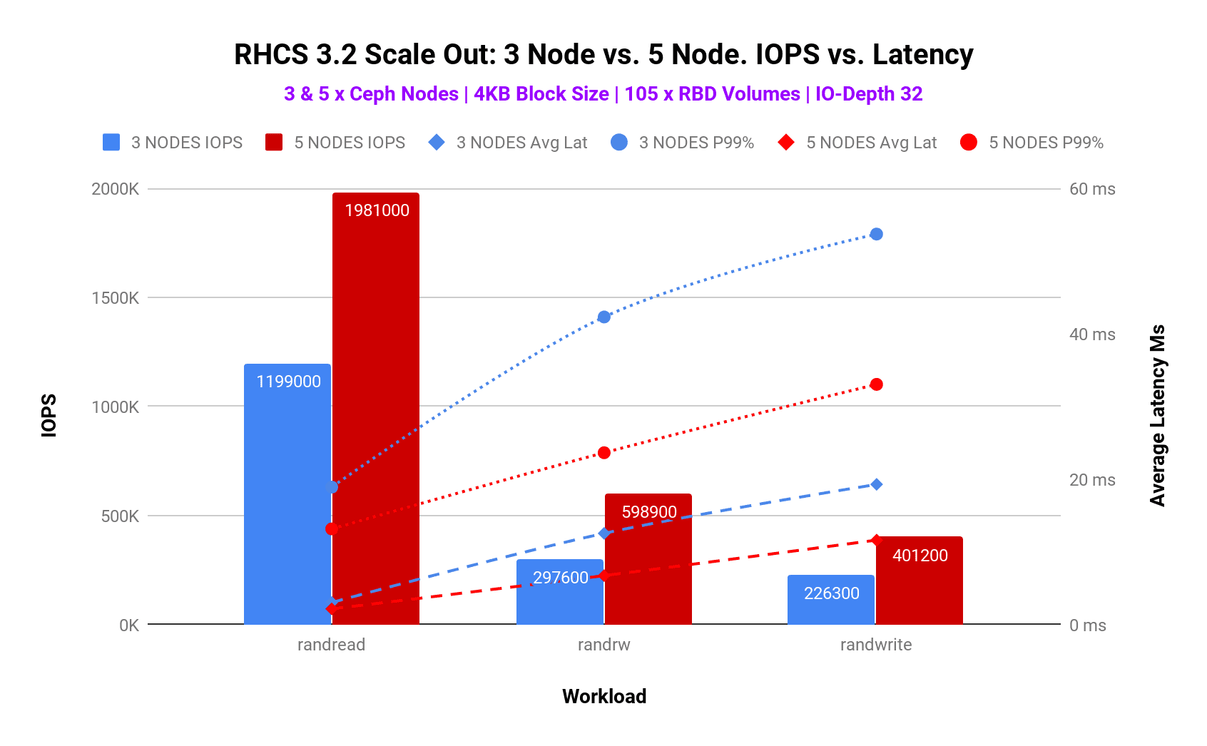 RHCS 可扩展性测试包括在一个 3 节点 Ceph 集群中添加 2 个额外的节点,使总数为 5 个节点。在 3 个节点和 5 个节点配置期间,针对随机读取、随机写入和随机读取写入 70/30 混合工作负载记录了小型块(4K)性能。