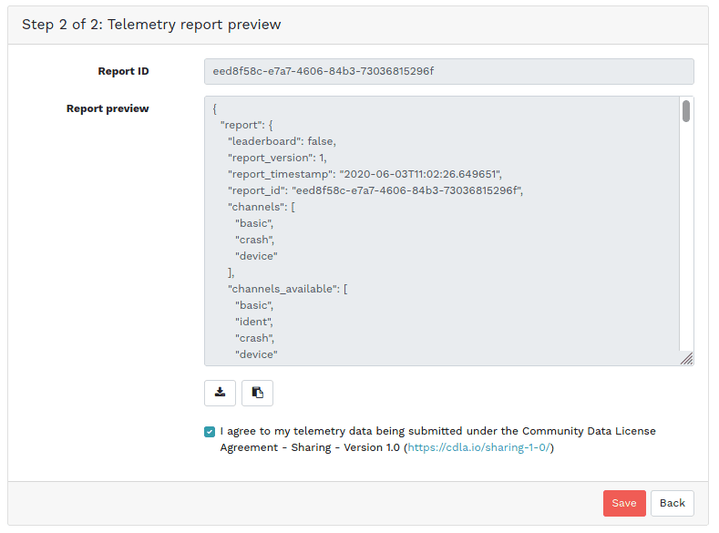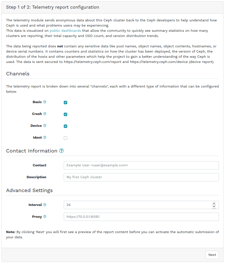 最后,如果您想启用 将遥测数据提交 到您的集群,现在有一个专门的页面/工作流程来执行此任务,包括预览将传回 Ceph 项目的数据。