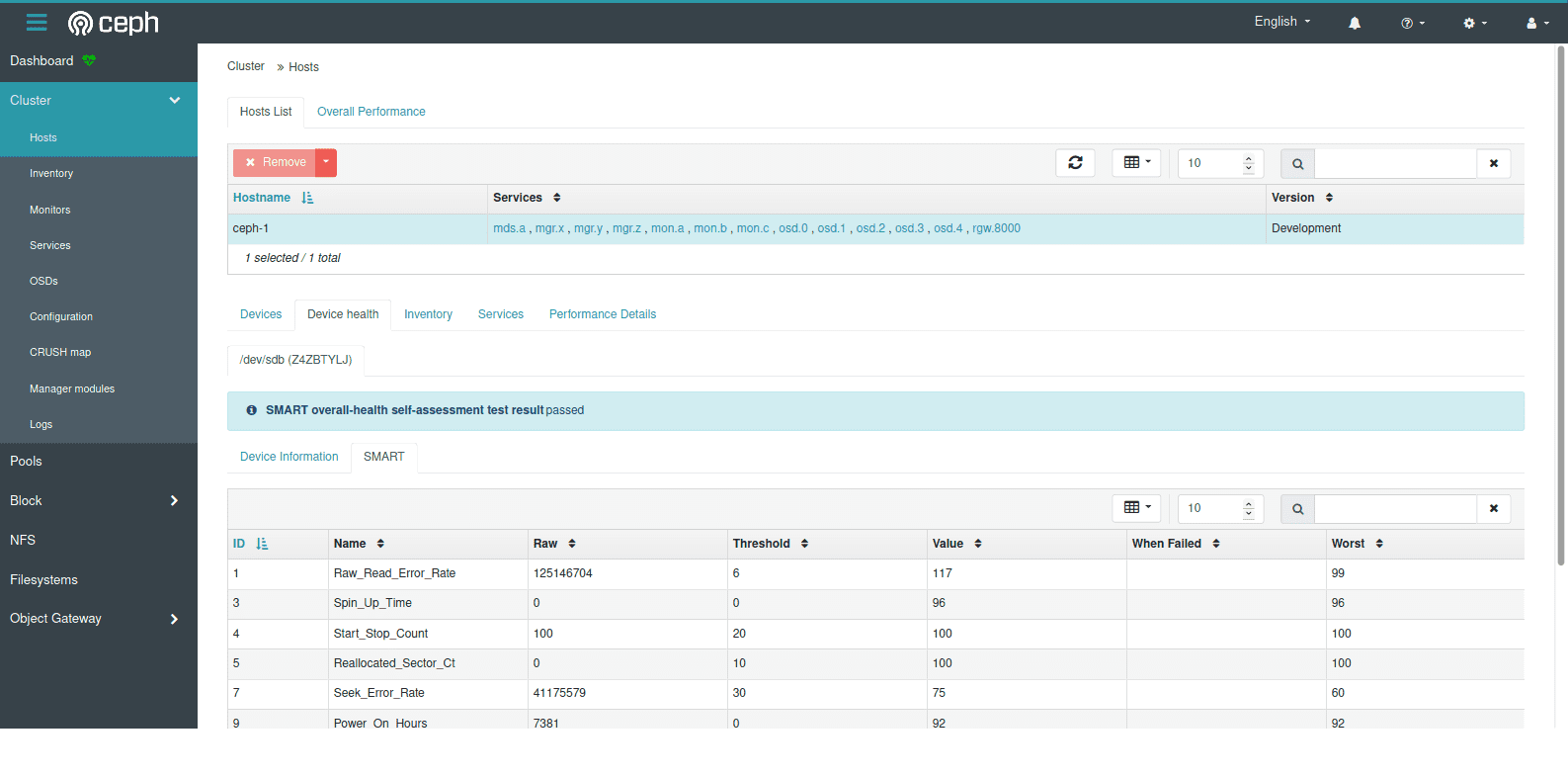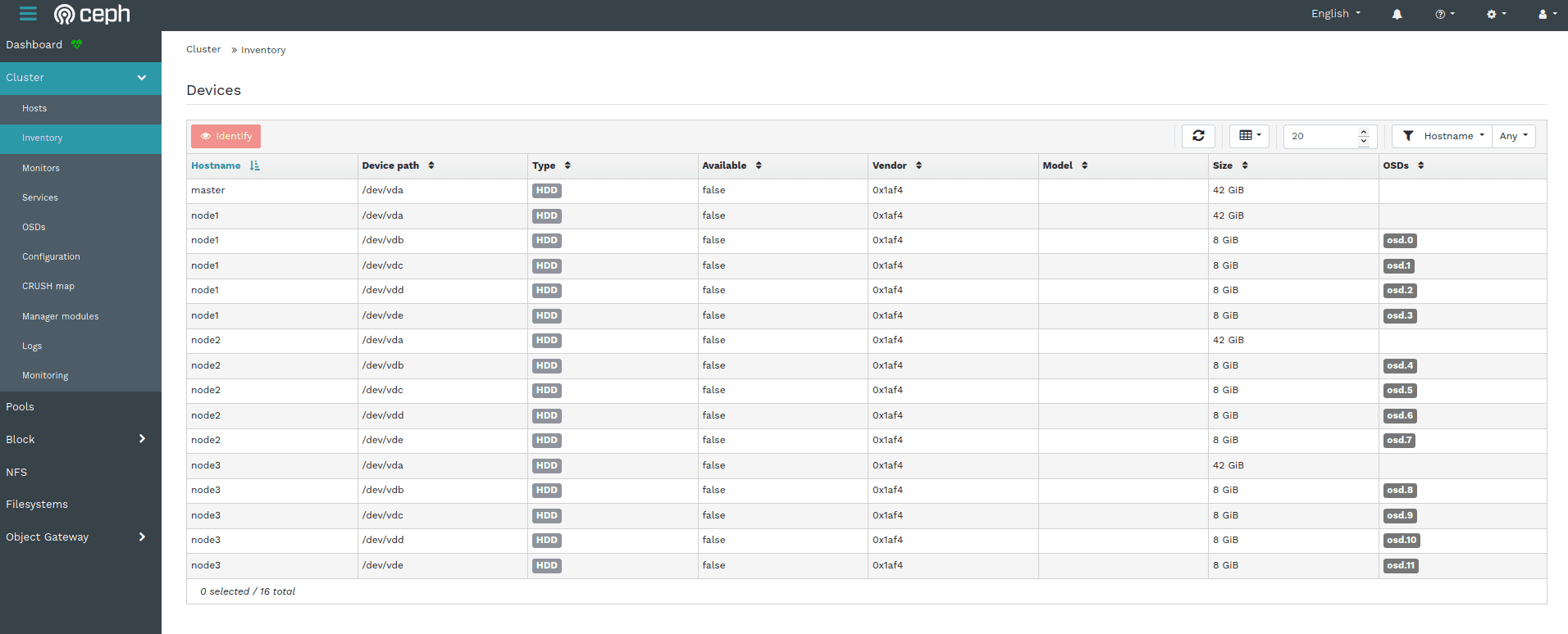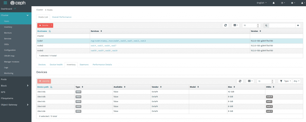 清单页面汇总了连接到集群所有节点的所有存储设备的信息,它们分配的 OSD 以及其他相关信息。