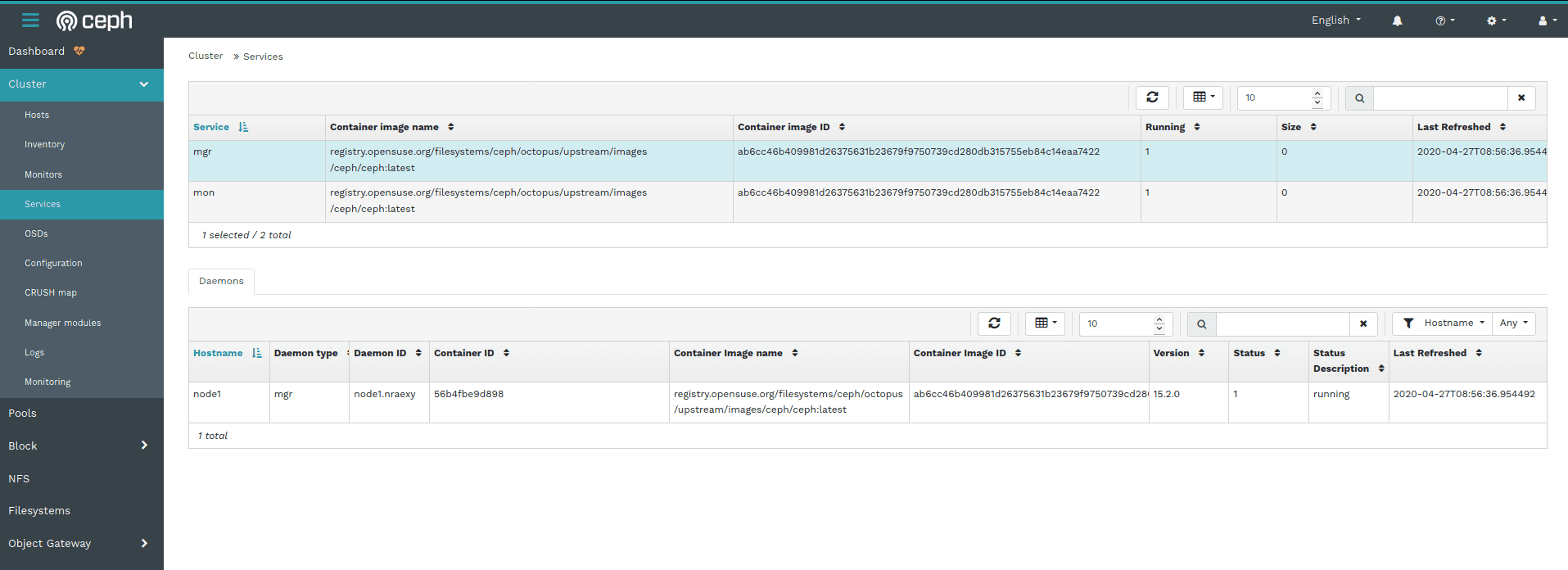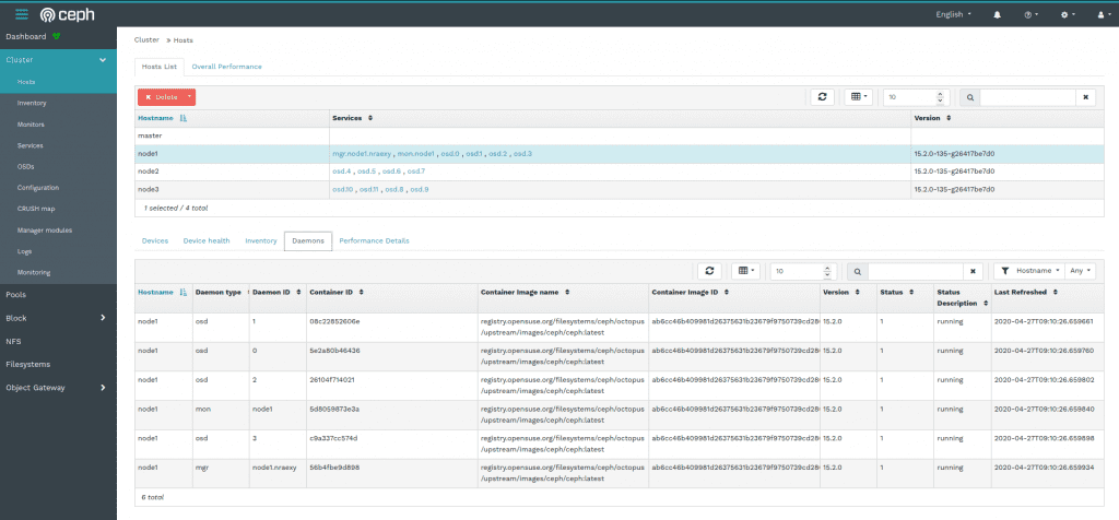 这里显示的服务页面为您提供了作为 docker 容器部署的各种服务的概述,以及更多详细信息,例如它们基于的 docker 镜像、Ceph 版本或其当前的运行时状态。