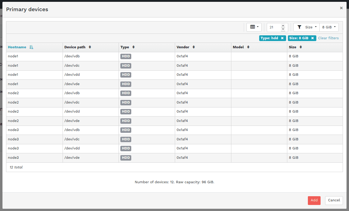 首先为您的主设备创建一个自定义过滤器。 所有匹配此过滤器的设备都将用于 OSD 创建过程。 您可以按类型(SSD 或 HDD)、供应商、型号和大小进行过滤。 在使用 SSD 作为共享设备时,您还可以选择类似的步骤中的 WAL 和 DB 设备。