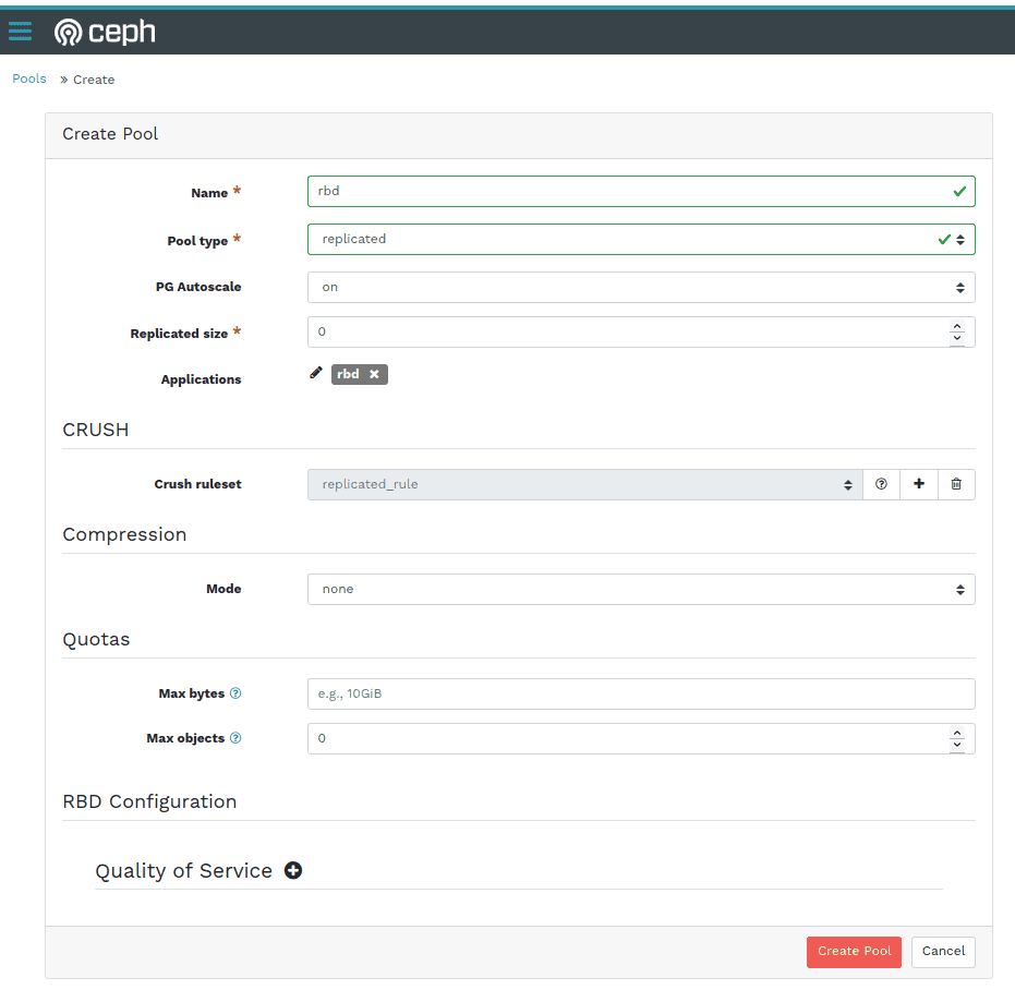 Ceph 仪表盘 - 创建池对话框