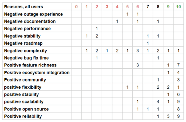 虽然“可靠性”和“可扩展性”更频繁地出现在推荐者分数(9 或 10 分)的原因中,但良好的或不好的性能都没有对决策产生显著影响。