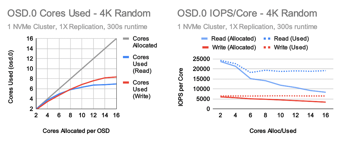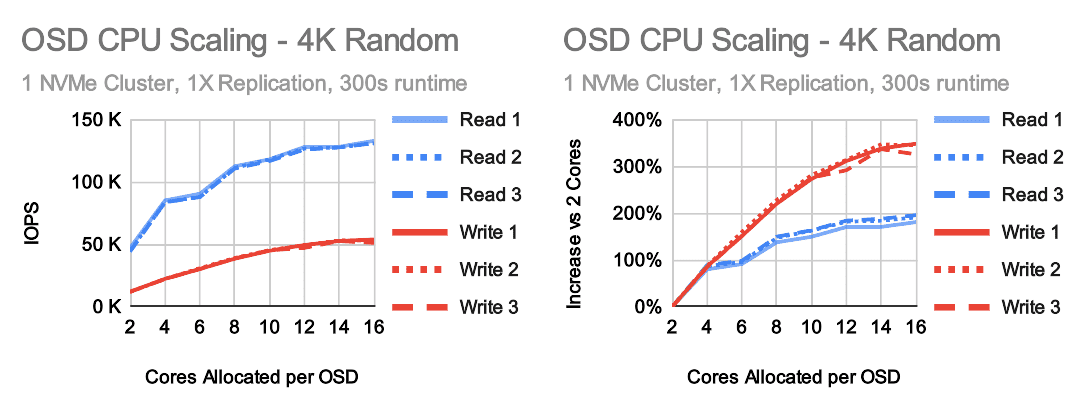 首先要注意的是,性能在 2 个和 4 个核心之间增加了大约 100%。几乎是线性提升。但是,在 4 个核心之后,收益开始减慢。从 4 个到 16 个核心只会再增加 100%,收益几乎完全稳定在 10 个核心。写入性能的扩展更高,在 14-16 个分配的核心处达到顶峰,约为 350%。但是,Ceph OSD 真的在使用这些测试中的所有核心吗?