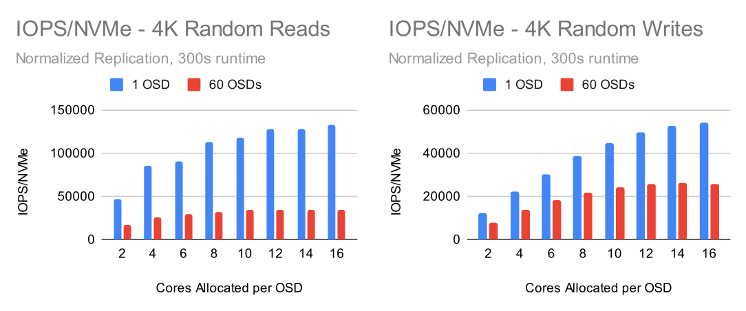 在查看 60 个 OSD 集群测试结果时,有几点立即显现出来。虽然曲线看起来与单个 OSD 测试相似,但读取和写入的性能在每个 OSD 上最多为 8-10 个核心,在写入时最多为 12 个核心。在单个 OSD 测试中,读取和写入收益分别达到约 200% 和 350%。在完整的集群配置中,收益分别达到 100% 和 250%。