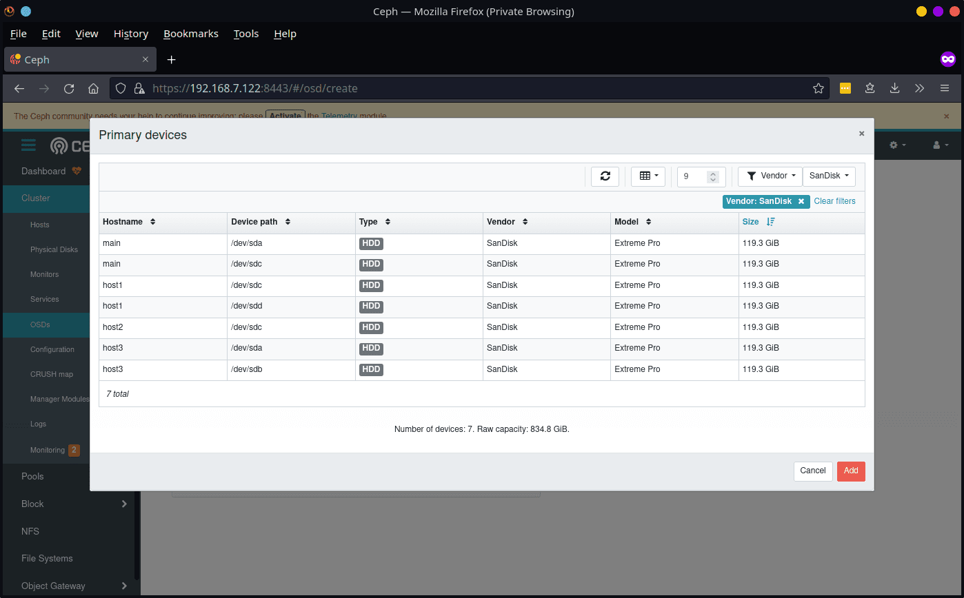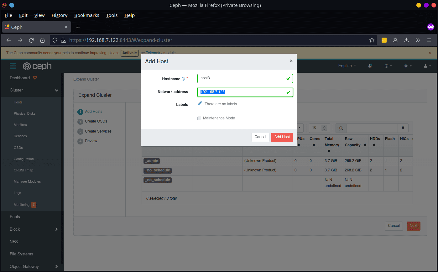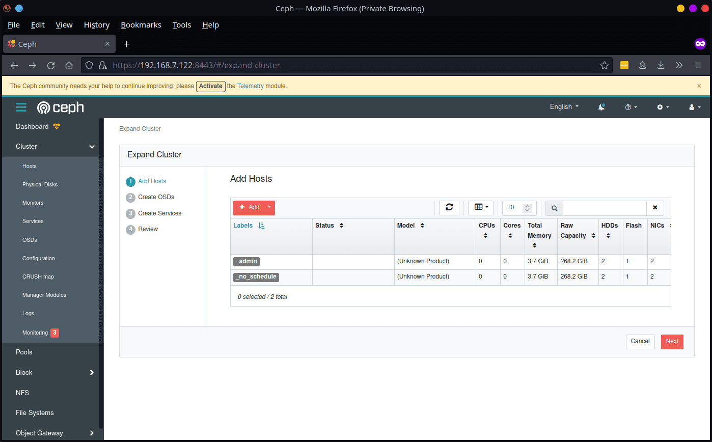我们还有需要配置的其他 Pi。您可以完成使用 Cephadm 扩展集群,但为了好玩,让我们看看如何使用仪表板来完成此操作。