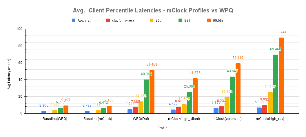 下图表显示了平均完成延迟(clat)以及 WPQ 调度器和 mClock 调度器配置的平均第 95、99 和 99.5 百分位数。此外,还显示了 snaptrim 和恢复操作处于活动状态期间观察到的平均 clat 的更准确的度量值。这表示为图表中的 clat (trim+rec)。这显示了 mClock 配置相对于 WPQ 调度器的有效性。
