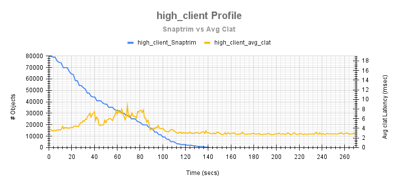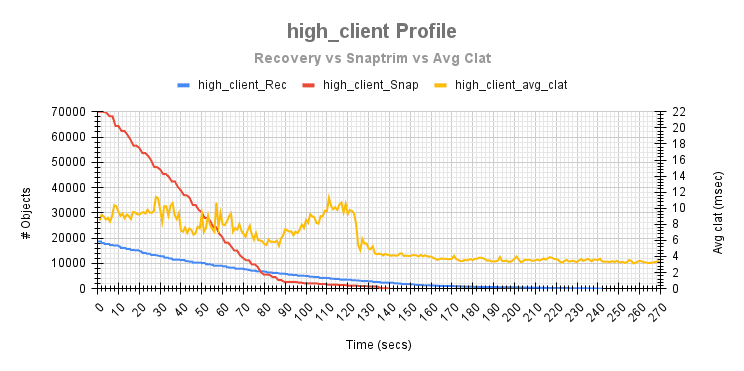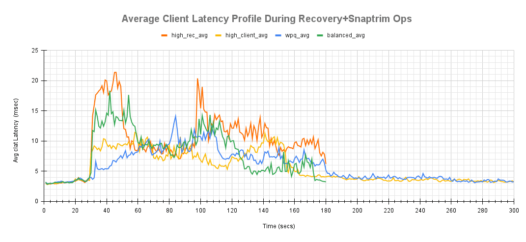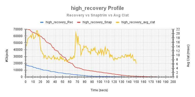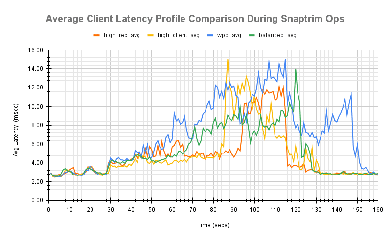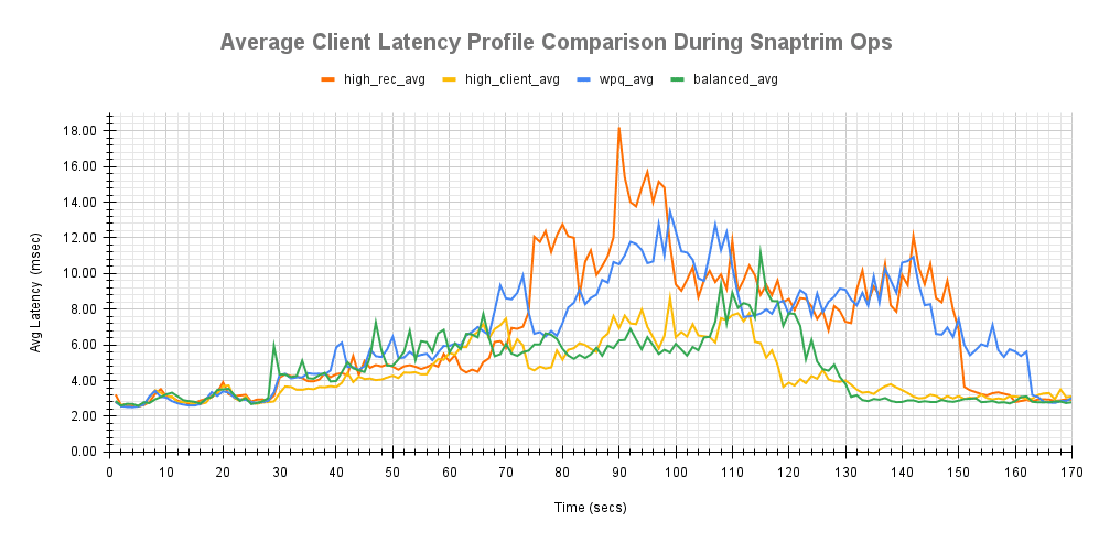 在下面的测试运行期间,显示了 snaptrim 和恢复操作期间平均客户端延迟变化的比较。这跟踪了后台操作的不同点对平均客户端完成延迟的影响。
