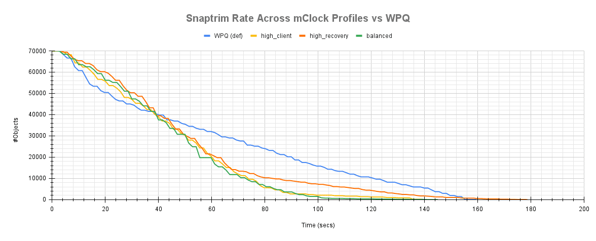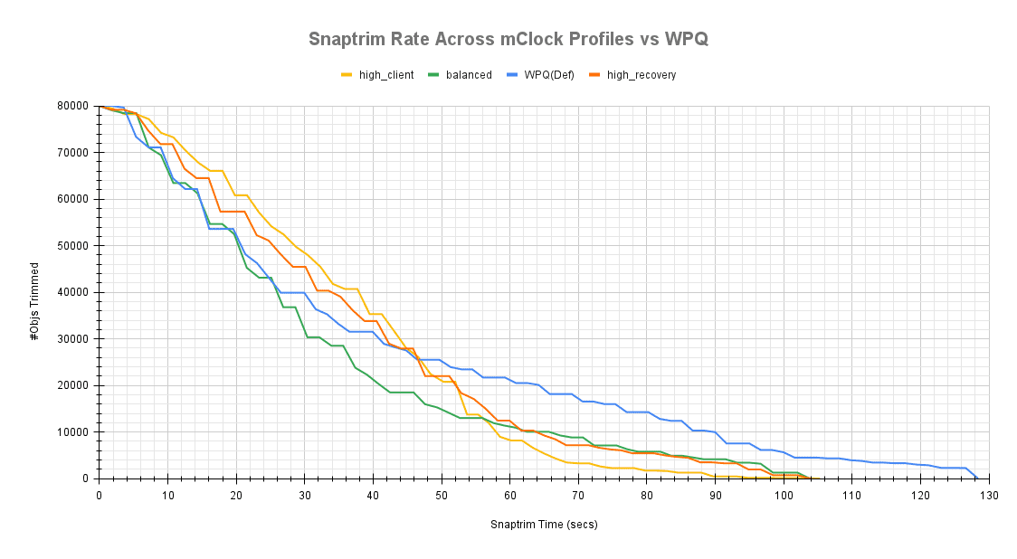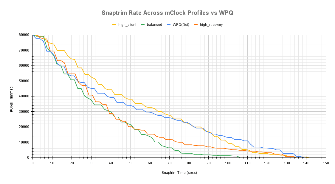mClock 配置会影响 snaptrim 速率和时间,下面的图表显示了它们与 WPQ 调度器的比较。