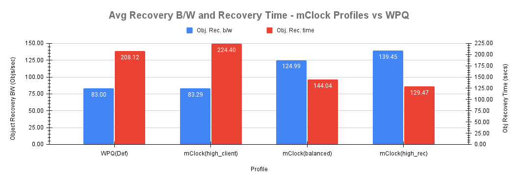 该测试的另一个主要方面是分析 mClock 配置如何影响恢复操作,通过建立恢复吞吐量、恢复时间和对客户端操作的影响等指标。如下面的柱状图所示,high_client_ops 配置对恢复操作影响最大。这是预期的,因为为后台恢复分配的保留量最低。平均恢复吞吐量和时间与 WPQ 调度器看到的相似,分别为 83 个对象/秒和 224 秒。