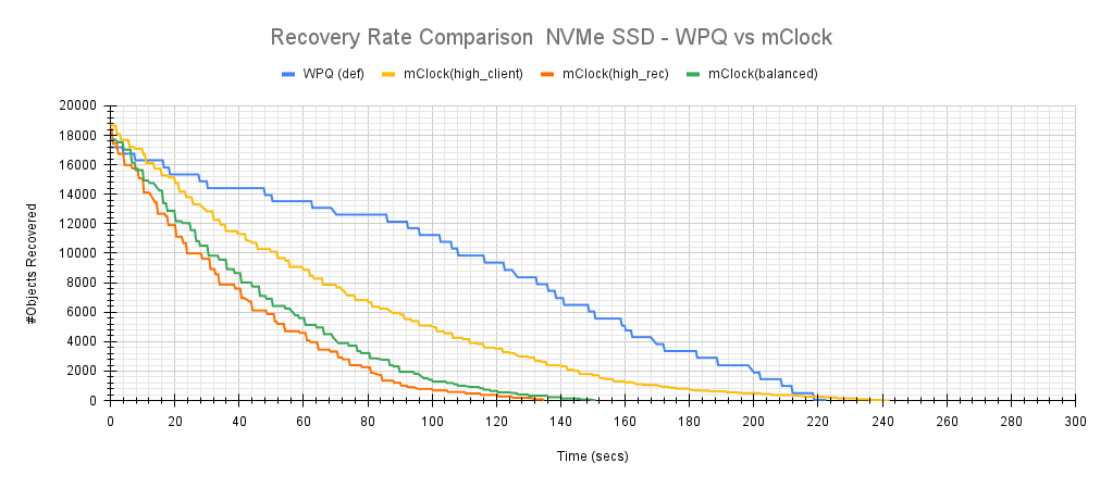 图 15 显示了 WPQ 调度器和 mClock 配置之间的恢复速率。