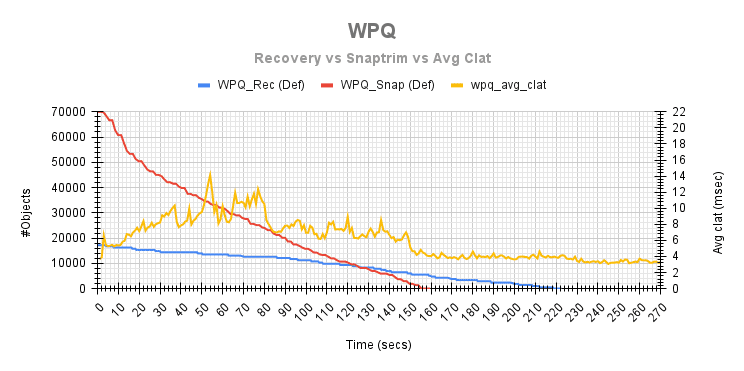 使用 WPQ 获得的整体平均客户端完成延迟为 3.280 毫秒。但是,在 snaptrim 阶段,平均客户端完成延迟为 6.2 毫秒,与基线值 2.747 毫秒相比增加了近 126%!