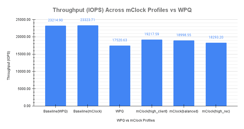 使用默认 Ceph 配置的 WPQ 调度器的平均客户端吞吐量为 17520.63 IOPS,比基线 (WPQ) 吞吐量低近 25%。但是,使用 mClock 调度器和默认high_client_ops配置文件,与 WPQ 调度器相比,平均客户端吞吐量几乎高 10%,为 19217.59 IOPS。这满足了 mClock 配置中客户端操作设置的 50% 最小保留标准。