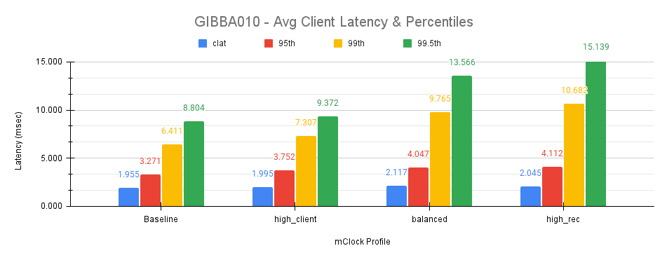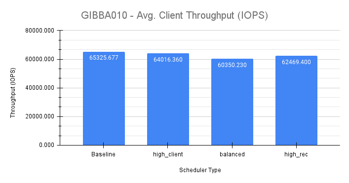 测得的平均基线吞吐量约为 ~65326 IOPS。图 20 下面显示了在客户端节点 Gibba010 上进行测试期间,mClock 配置files之间的平均客户端吞吐量比较。