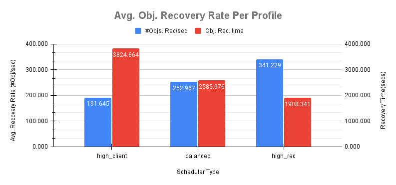 如预期的那样,high_recovery_ops 配置具有最高的平均恢复吞吐量,接近 140 个对象/秒,并且恢复大约 18K 个对象的最短平均恢复时间约为 130 秒。