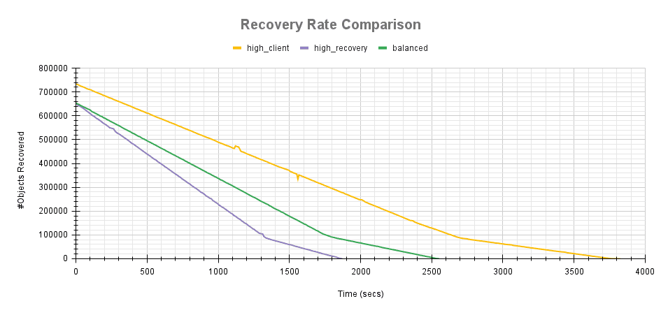 balanced 配置提供了一个很好的中间地带,为客户端和恢复操作分配相同的保留量和权重。恢复速率曲线介于 high_recovery_ops 和 high_client_ops 曲线之间,平均吞吐量约为 125 个对象/秒,完成恢复平均需要 144 秒。