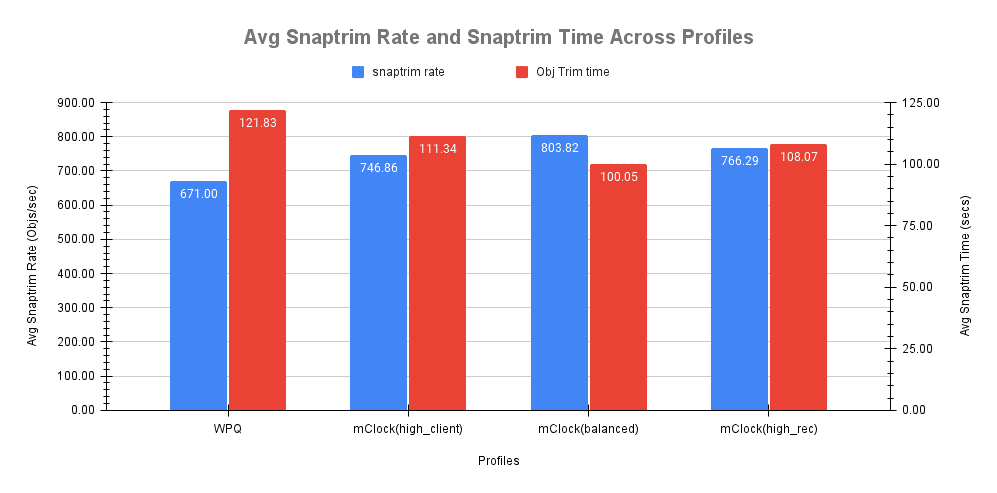 另一个重要的指标是 mClock 配置对 snaptrim 速率和时间的影响,以及它们与 WPQ 调度器的比较。