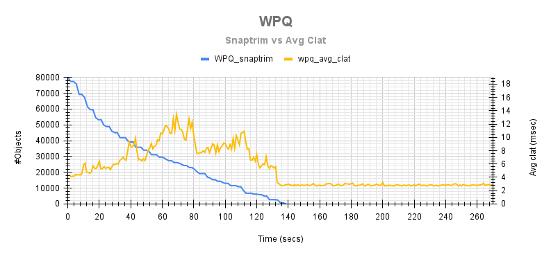 使用 WPQ 调度器,平均 snaptrim 速率约为 431 个对象/秒,修剪 70K 个对象所需的平均持续时间为 164.24 秒。
