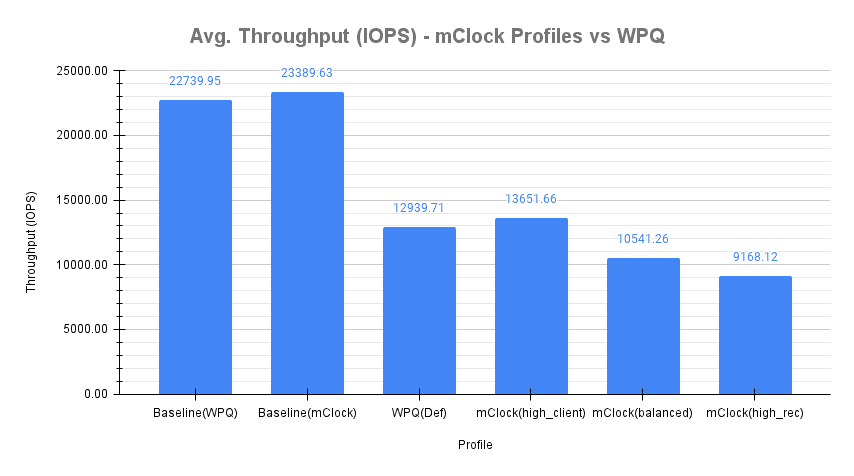 使用默认 Ceph 配置的 WPQ 调度器的平均客户端吞吐量为 12939.71 IOPS,比基线(WPQ)吞吐量低 43%。但是,使用 mClock 调度器和默认 high_client_ops 配置,平均客户端吞吐量比 WPQ 调度器看到的平均吞吐量高约 5.5%,为 13651.66 IOPS。这满足了 mClock 配置中为客户端操作设置的 50% 的最低保留标准。