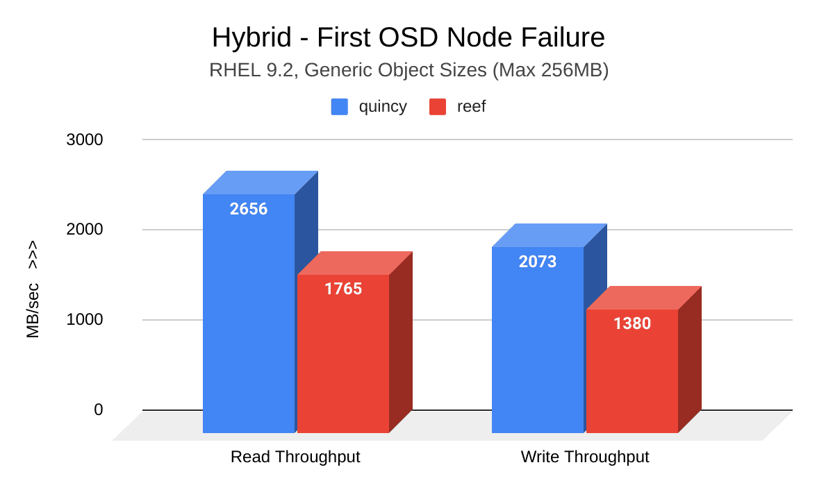 下图显示了在第一次诱导的OSD节点故障后Quincy(蓝色)和Reef(红色)之间的读取和写入吞吐量(MB/秒)的比较。Reef显示吞吐量下降