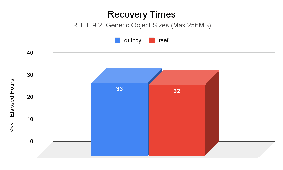 下图显示了在两次诱导的OSD节点故障后Quincy(蓝色)和Reef(红色)之间的恢复时间(小时)的比较。与Quincy相比,Reef中的PG达到active+clean状态的时间缩短了1小时。