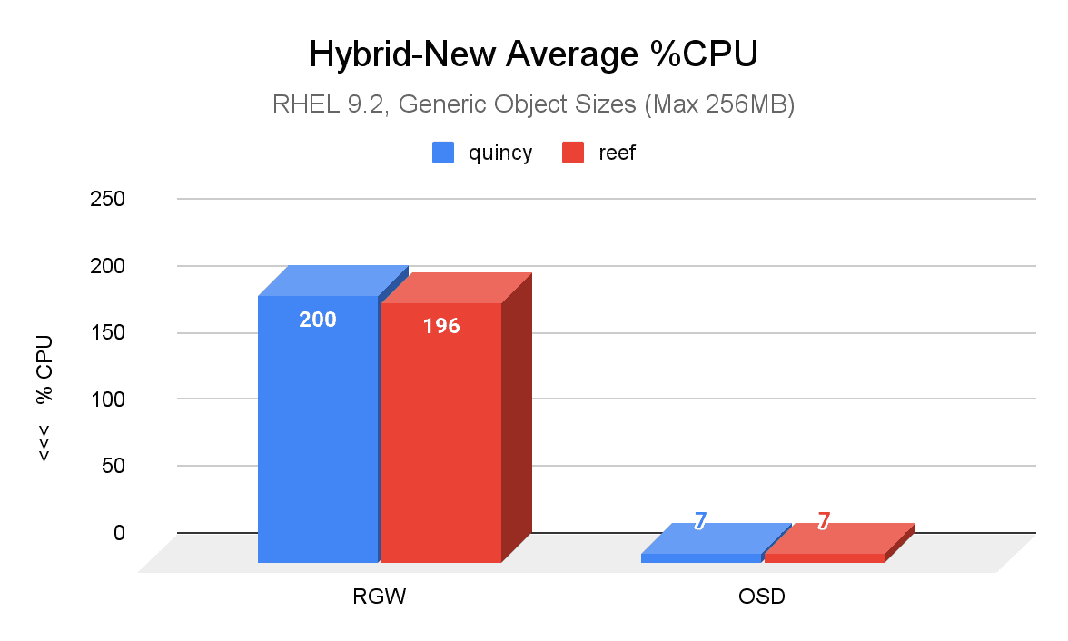 下图显示了最显著的差异,它是新集群中通用对象大小的Quincy(蓝色)和Reef(红色)之间的平均CPU使用率百分比的比较。Reef的RGW CPU使用率与Quincy相比略有改善。