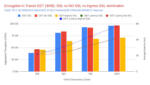 总而言之,Ceph 对象网关 (RGW) 上的 SSL/TLS 为大多数对象工作负载提供了安全性和性能之间的出色平衡。它为大型对象提供接近基线的吞吐量,并为小型对象提供适度的性能下降,同时保持端到端加密。
