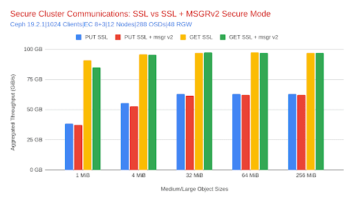 对于需要对客户端和集群服务之间的流量进行强数据保护的环境,S3 端点上的 TLS 和内部加密的 Messenger v2 的组合提供了强大的安全性,且对性能的影响最小。
