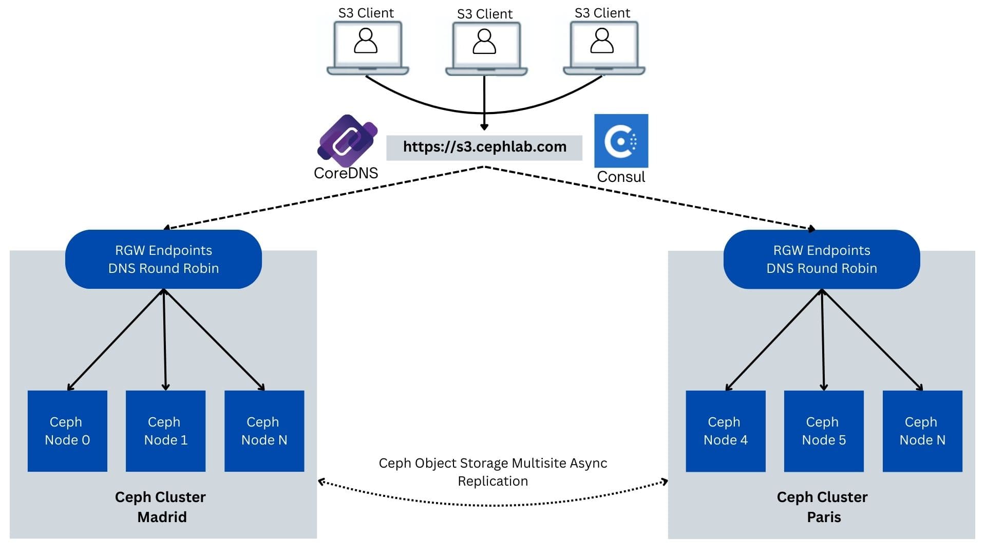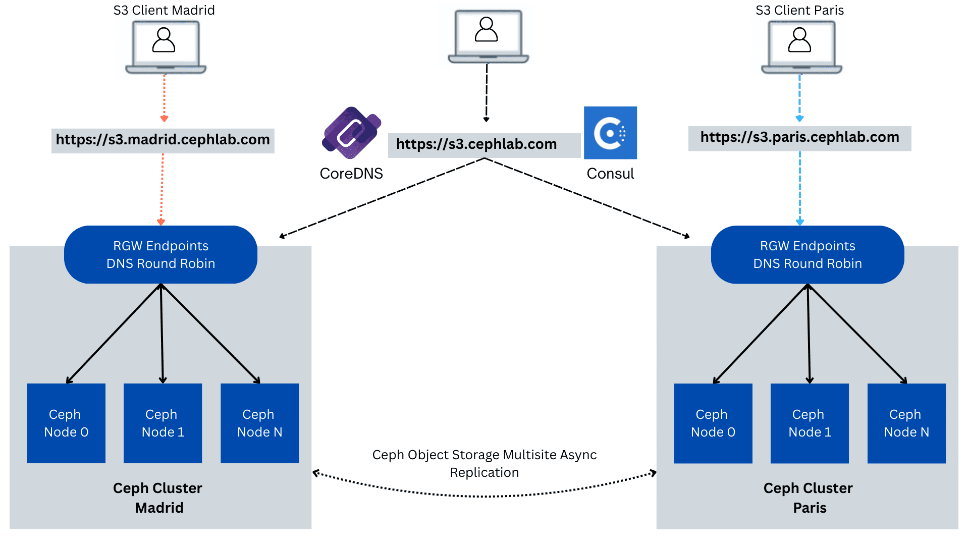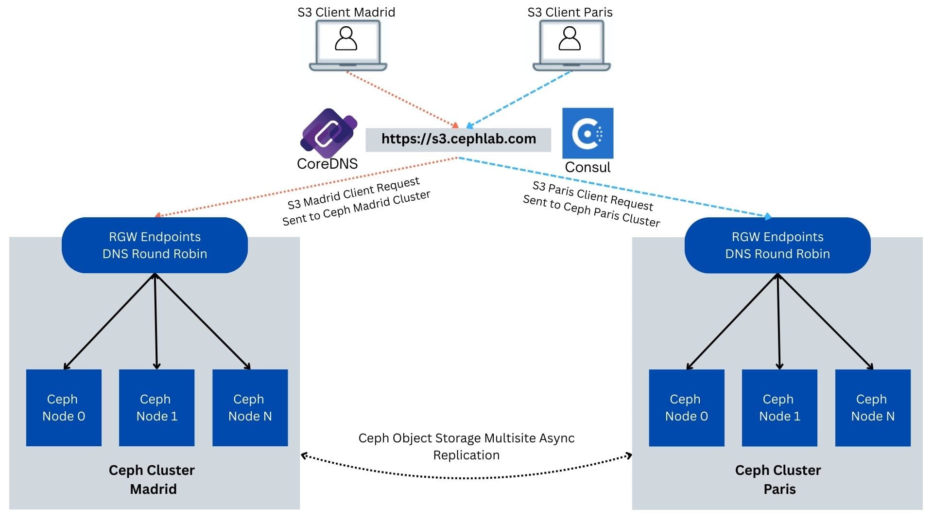在第三和第四部分中,我们将 Ceph 对象多站点(马德里和巴黎数据中心之间的有活动/活动数据复制)与 Consul 全局负载均衡控制平面相结合,确保单个 S3 端点始终路由到最近的健康 ingress,并在需要时跨站点故障转移,而无需任何客户端 URL 或 SDK 更改。每个站点保持独立(自己的控制平面和 Ceph 集群),同时通过 WAN 协同工作,以便客户端请求始终到达健康的站点。