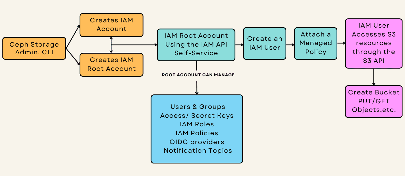 根账户用户现在已准备好创建和管理 IAM 账户内的用户、组、角色和权限。这些资源可以通过 RGW 端点提供的 IAM API 进行管理和管理。此时,RGW 管理员可以将 IAM 账户的根用户的凭据提供给负责该账户的人员。该人员可以使用 RGW 端点提供的 IAM API 执行与他们的账户相关的所有管理操作,这对于 RGW 管理员/操作员来说是完全非人工的。
