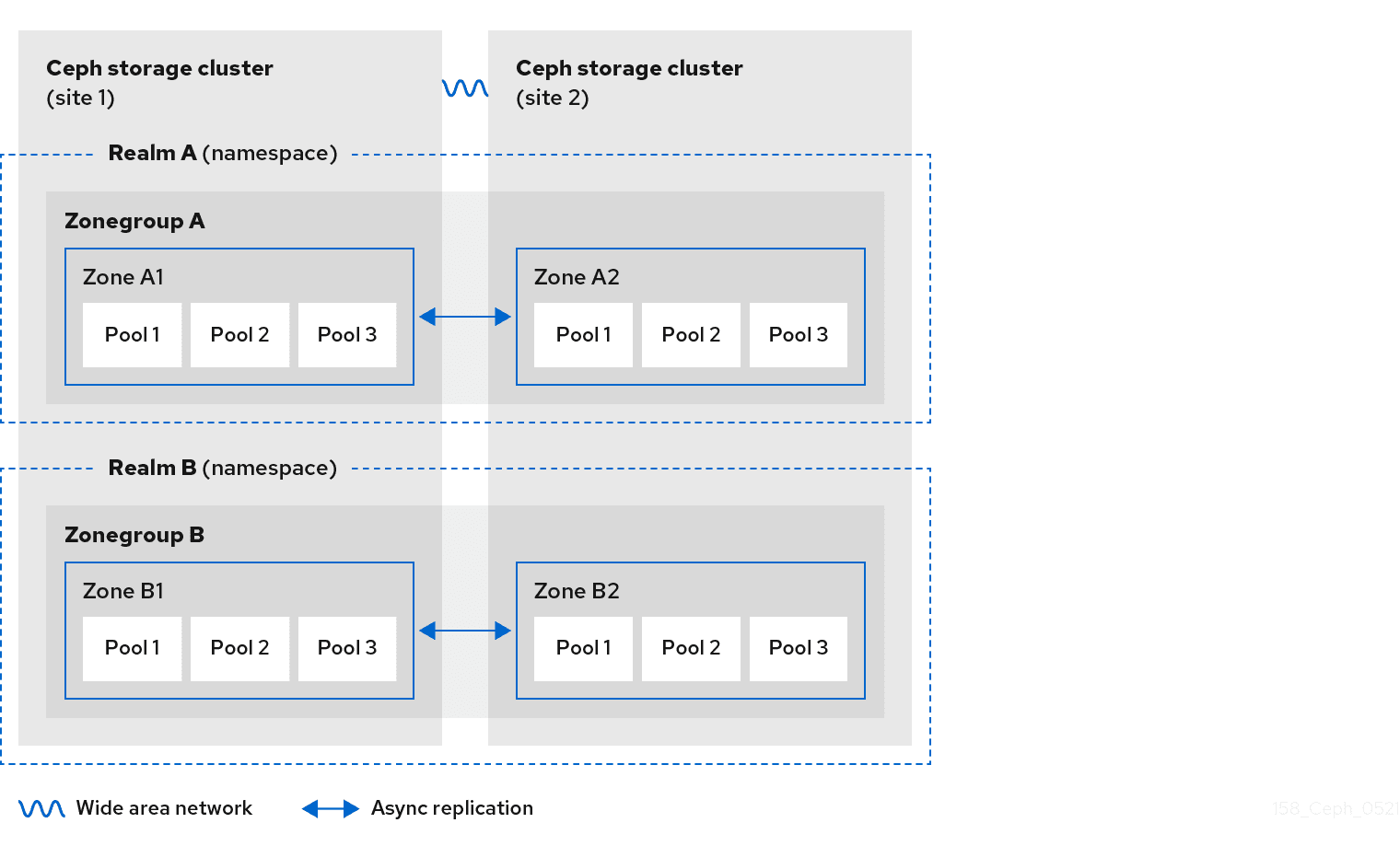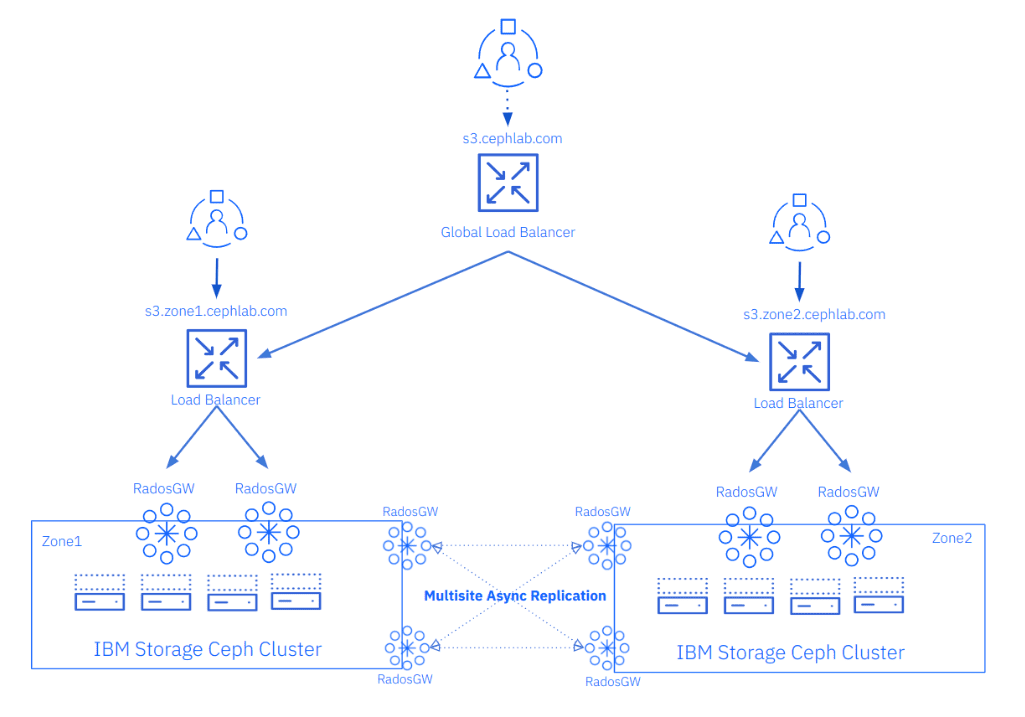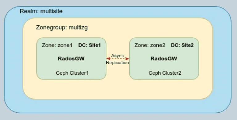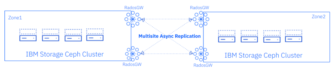 Ceph 对象存储集群可以地理分散,从而提高数据可用性并降低硬件故障、自然灾害或其他事件导致的数据丢失风险。 由于我们正在进行最终一致性的异步复制,因此没有网络延迟要求。