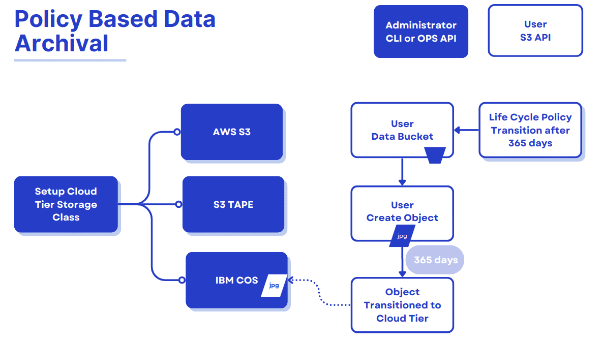 除了本地分层之外,Ceph 还提供基于策略的数据归档和检索功能,可与 S3 兼容的平台集成,用于异地数据管理。组织可以使用此功能将数据归档到基于云的层,例如 IBM Cloud Object Storage、AWS S3、Azure Blob 或 S3 磁带端点,以实现长期保留、灾难恢复或成本优化的冷存储。通过利用基于策略的自动化,Ceph 确保数据根据预定义的生命周期规则移动到云或其他目的地,从而增强其在混合云策略中的价值。