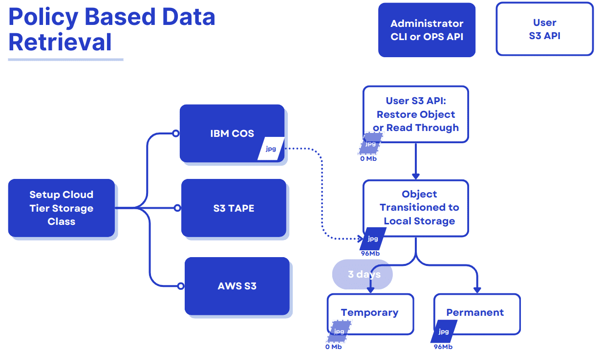 - 永久恢复:这些对象完全重新集成到 Ceph 集群中,并像(并成为)常规对象一样处理,并受标准生命周期策略和复制过程的约束。