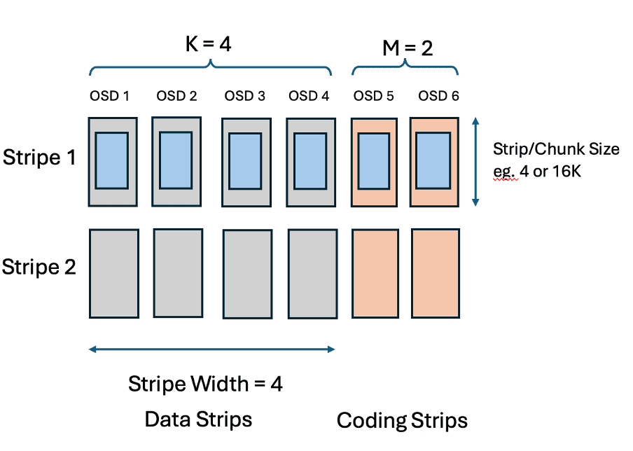 使用纠删码池,您可以创建一个纠删码配置文件,选择 K+M 的值。 纠删码池所需的最小 OSD 数量为 K+M,就像 replica-3 池一样,建议这些 OSD 位于不同的服务器中以实现容错。 M 的选择定义了您拥有的冗余量,M=2 表示您可以承受两个 OSD 发生故障 - 与 replica-3 池相同。 纠删码池的存储开销为 (K+M / K),因此 4+2 池的存储开销为 150%。