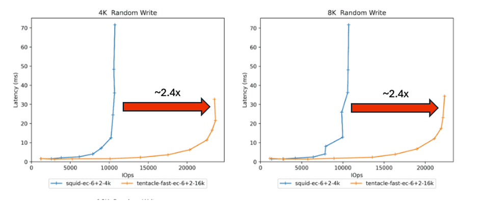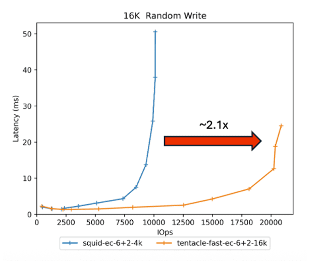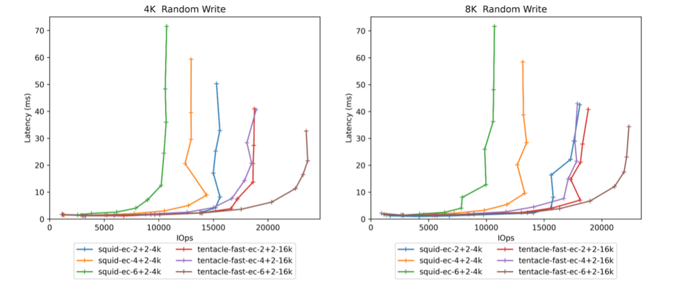 以前在 Squid 中,写入性能随着 K 的增加而降低,原因是整个条带始终被读取和写入,这意味着对于更宽的擦除码(例如 4+2 和 6+2),开销会更高,性能会降低。 将 K 增加到 6 以上会导致性能进一步下降。