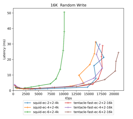 您的 K 选择会影响您从系统获得的性能。 这里有一组图表,它们执行相同的 4/8/16k 随机写入测试,比较 2+2、4+2 和 6+2 EC 配置