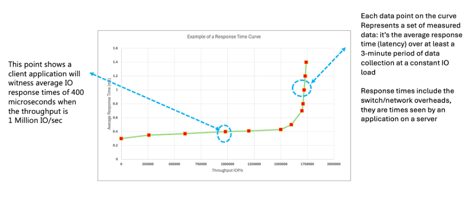 响应曲线绘制的是每秒输入/输出 (IOPS) 与延迟之间的关系。从图表的左下角开始,预期随着向存储系统的队列深度增加,IOPS 也会增加。在曲线的某个点,也称为拐点,这是饱和点,此时吞吐量不再增加,并且将额外的工作添加到存储系统队列只会增加延迟。 这就是产生曲线“曲棍球棒”形状的原因。